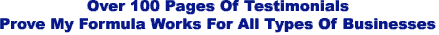 This is the only product in its class (to my knowledge) with over 100 pages of real testimonials from real, live people who actually exist. These are NOT made up. I understand that any yahoo on the net can type up some testimonials and stick them on a page. But I give you my word of honor that these are legit. A few of them don't have last names because I haven't obtained written permission to use their comments. They just zipped me emails to say thanks, and I'm reprinting them here for you. In a second, I'm going to explain my crazy formula. But first, read these . . .